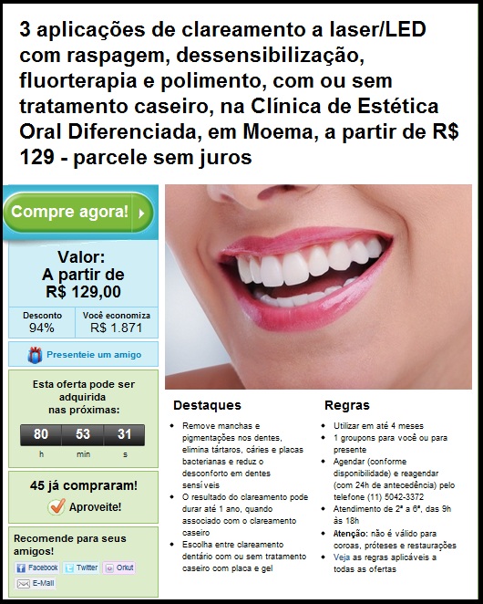 PACIENTE – Observe bem o que você está comprando por aí. Os detalhes nas entrelinhas ainda vão contra o Código de Defesa do Consumidor. A clínica ainda fornece informações erradas no anúncio. Um profissional da odontologia que diz que fluorterapia “elimina tártaros” não pode ser confiável.