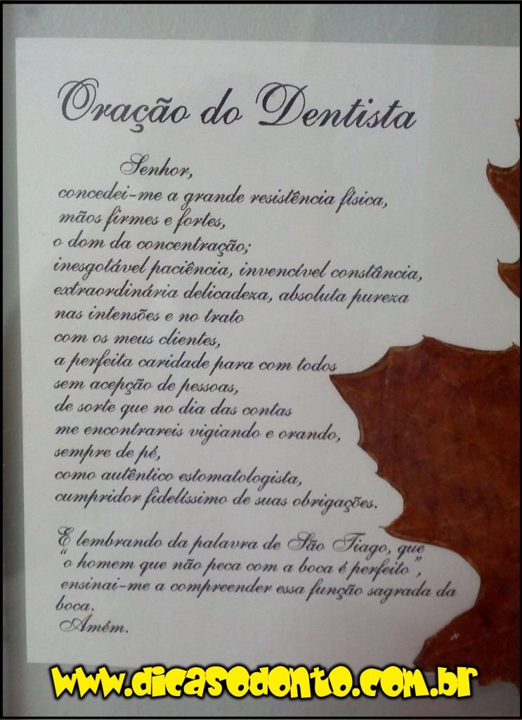 No início de 2011, você já acompanhou uma oração escrita e um azulejo, totalmente voltada para a nossa profissão – a Odontologia. Hoje, em um consultório de um colega, me deparei com uma oração diferente, que também pede por destreza, delicadeza e paciência.