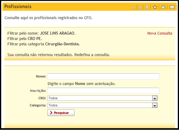 Prestem atenção em alguns detalhes para saber se a pessoa que vai tratar a sua boca é dentista de verdade. Dentista tem que ter carimbo com nome e CRO – número do conselho regional de odontologia de cada estado. O site do Conselho Federal de Odontologia (CFO) oferece uma ferramenta simples para consulta de CRO. Nesse caso fiz a pesquisa com o nome do falsário, vejam só o print: